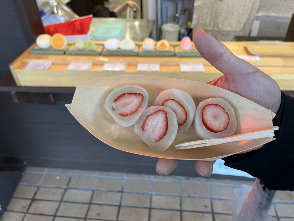 Kleine Stärkung zwischendurch mit gegrillten Mochi am Spieß.