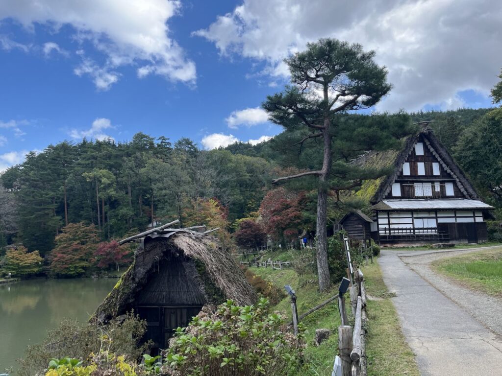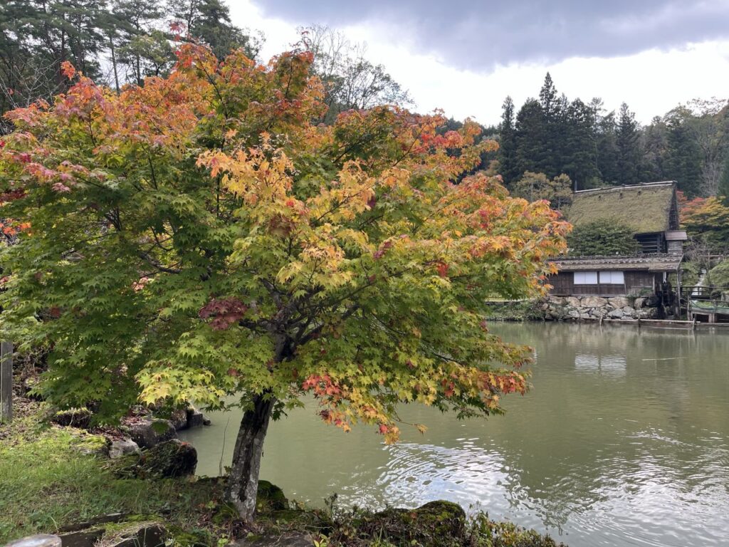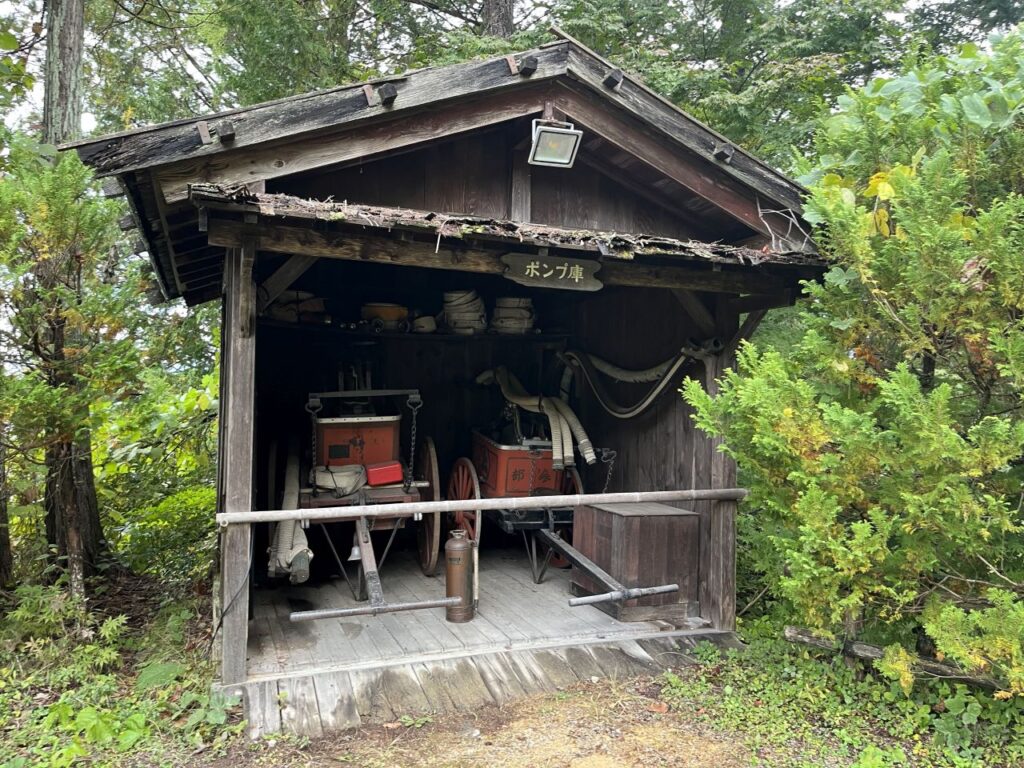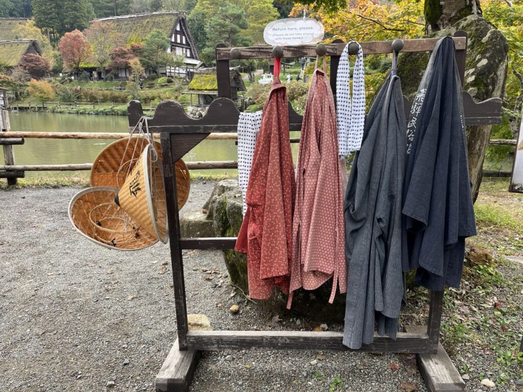 Übersichtsplan des Freilichtmuseums. Es sind etwa 30 Gebäude auf dem Gelände verteilt. Der erste Anblick beim Betreten des Geländes ist der kleine See und die Baugruppe auf der gegenüberliegenden Seite. Und hier haben wir zum erstenmal auch einen Hauch von Herbstfärbung gesehen. Während zuhause in Graz die Blätter bereits bunt verfärbt waren und teilweise schon von den Bäumen fielen, ist die Natur in Japan einige Wochen hinterher. Das Freilichtmuseum liegt auf über 647m Höhe über dem Meeresspiegel in den japanischen Alpen, da setzt die Laubfärbung etwas früher ein als in den Niederungen in Zentral-Honshu.Sehr interessant finde ich auch die oft nur ästeweise Verfärbung beim japanischen Ahorn. Man kann sich für ein Foto auch in japanische Überjacken und Hüte kleiden. Wir haben uns aber lieber auf den Weg gemacht, neugierig was es denn so zu sehen gibt.Bei all den Holzhäusern sind und waren Feuerwehrgerätschaften natürlich auch sehr wichtig. Dieses Bauernhaus stammt aus der Kiyomi Region westlich von Takayama. Die Sparren sind stärker als in anderen Gegenden, weil sie bis zu 2m Schnee aushalten müssen. Die schwache Neigung des Daches macht Schnee vom Dach schaufeln einfacher. Irgendwie drängte sich bei uns die Assoziation mit Tirol auf. Haus Arai, 2. Hälfte des 18. Jahrhunderts.