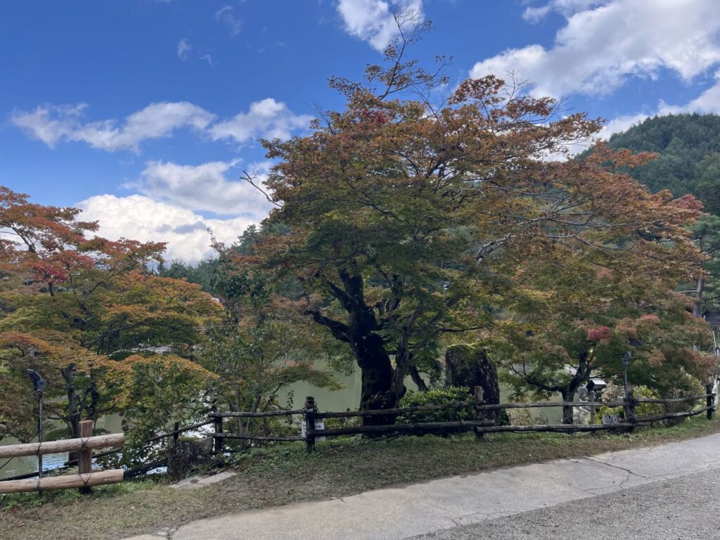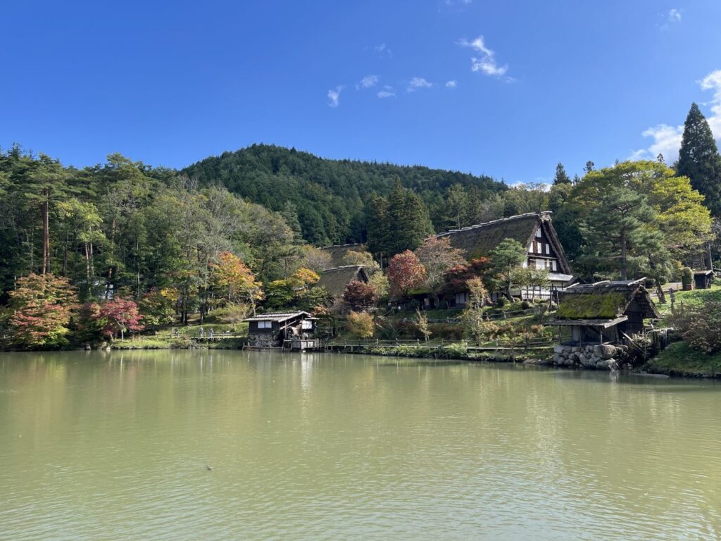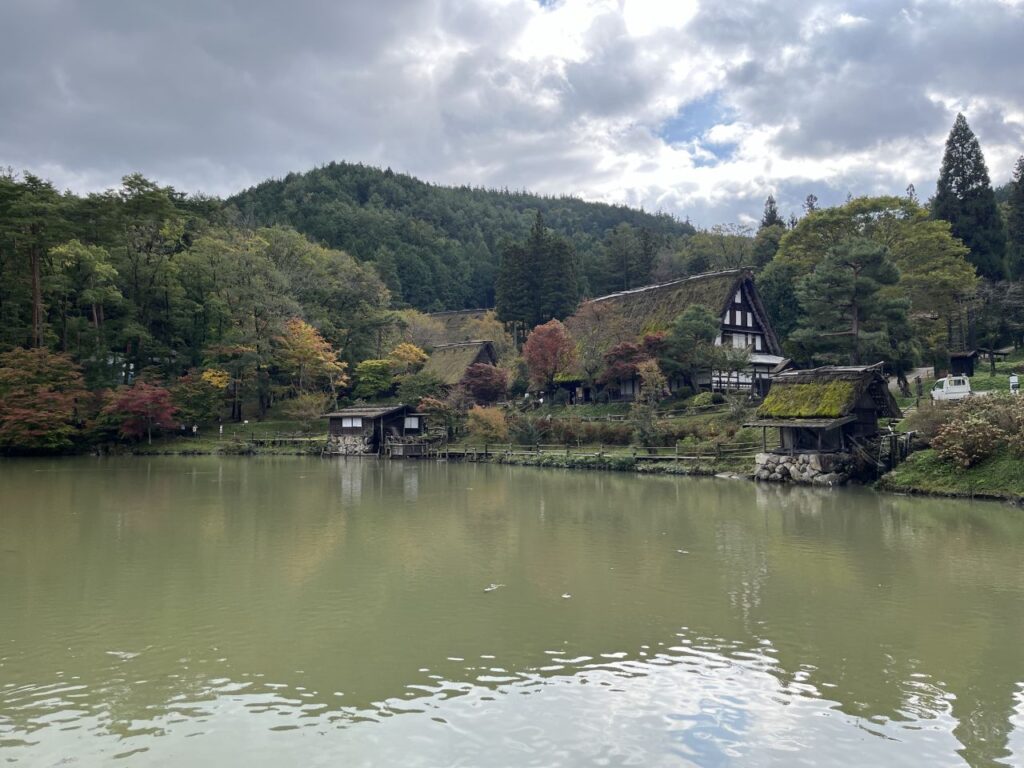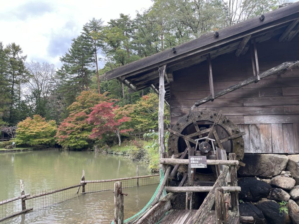 Übersichtsplan des Freilichtmuseums. Es sind etwa 30 Gebäude auf dem Gelände verteilt. Der erste Anblick beim Betreten des Geländes ist der kleine See und die Baugruppe auf der gegenüberliegenden Seite. Und hier haben wir zum erstenmal auch einen Hauch von Herbstfärbung gesehen. Während zuhause in Graz die Blätter bereits bunt verfärbt waren und teilweise schon von den Bäumen fielen, ist die Natur in Japan einige Wochen hinterher. Das Freilichtmuseum liegt auf über 647m Höhe über dem Meeresspiegel in den japanischen Alpen, da setzt die Laubfärbung etwas früher ein als in den Niederungen in Zentral-Honshu.Sehr interessant finde ich auch die oft nur ästeweise Verfärbung beim japanischen Ahorn. Man kann sich für ein Foto auch in japanische Überjacken und Hüte kleiden. Wir haben uns aber lieber auf den Weg gemacht, neugierig was es denn so zu sehen gibt.Bei all den Holzhäusern sind und waren Feuerwehrgerätschaften natürlich auch sehr wichtig. Dieses Bauernhaus stammt aus der Kiyomi Region westlich von Takayama. Die Sparren sind stärker als in anderen Gegenden, weil sie bis zu 2m Schnee aushalten müssen. Die schwache Neigung des Daches macht Schnee vom Dach schaufeln einfacher. Irgendwie drängte sich bei uns die Assoziation mit Tirol auf. Haus Arai, 2. Hälfte des 18. Jahrhunderts.