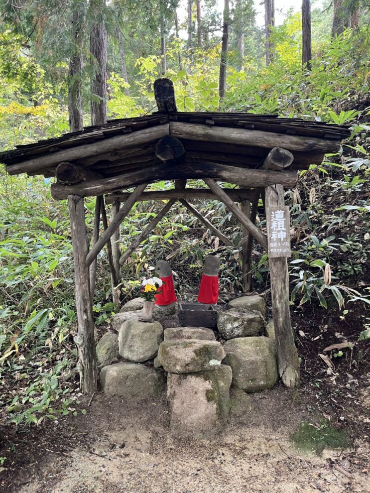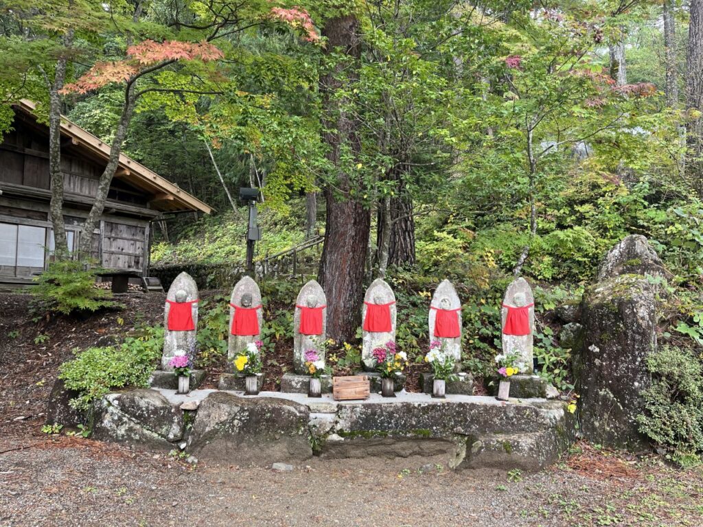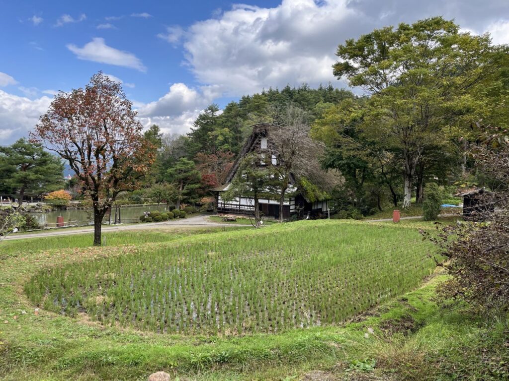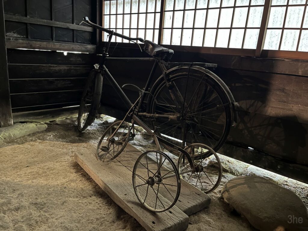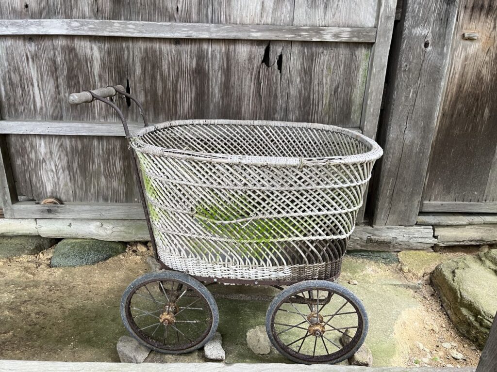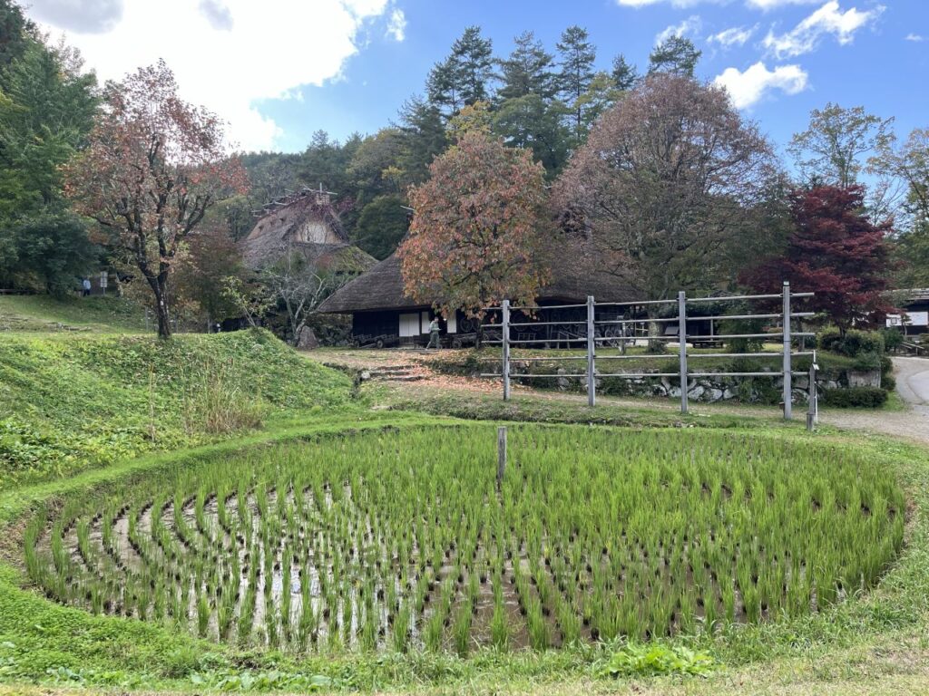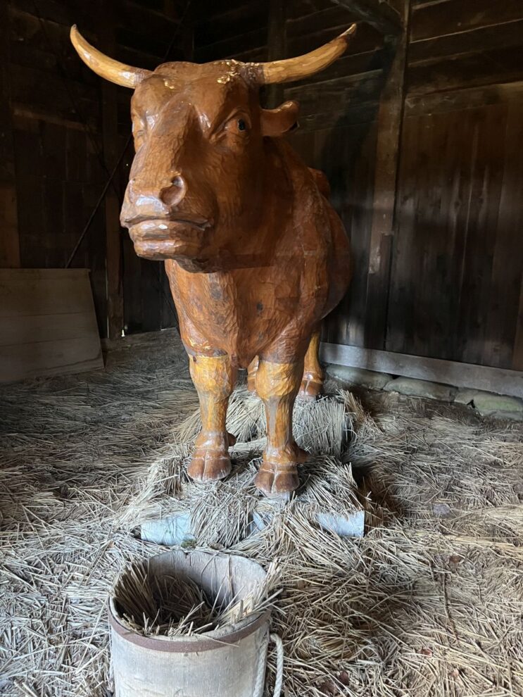 Und auch sonst im Museumsareal verteilt weitere Stationen der Frömmigkeit.Außerdem eine MühleTiere im Stall (im Gegensatz zum oberpfälzischen Freilandmuseum, in dem es tatsächlich ein paar lebende Kühe und anderes Getier gibt, ist dieser Ochse hier aus Holz).Weitere FortbewegungsmittelUnd sogar einen alten Kinder- oder Puppenwagen.Auch Reisfelder gibt es. Im Hintergrund Haus Nishioka, Mitte 19. Jahrhundert. Darin war die Ausstellung zur Serikultur.Ein Kurumada, ein rundes Reisfeld. Diese Form gibt es nur noch an 2 Orten in Japan.
