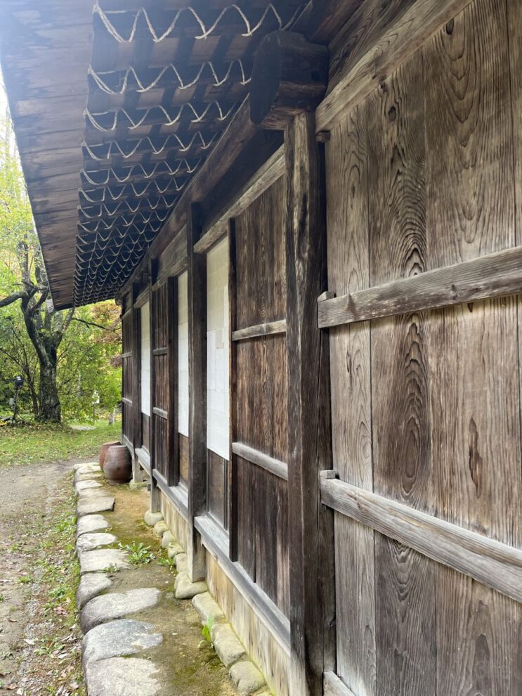 Bis etwa zur Mitte des 18. Jahrhunderts bestand der Boden in den Bauernhäusern aus festgestampfter Erde. Holzboden gab es wenn überhaupt nur in kleinen Bereichen. Tatamimatten kamen erst später. Um das Herdfeuer herum saß man jedoch sehr wohl auf Strohmatten. Übrigens werden im Freilichtmuseum jeden Tag morgens die Herdfeuer angezündet, um die Kondition in den Gebäuden weiterhin beizubehalten. Die Häuser waren und sind sehr dunkel, das Herdfeuer war in den Wintermonaten oft die einzige Lichtquelle. Die einzige Wärmequelle sowieso. Und japanische Wände sind dünn, auch in den Bergen. Seien es dünne Holzwände oder ähnlich dünne Holz-Lehm-Wände. Und die „Fenster“ sind papierbespannte Schiebeläden. Was in den Fotos immer so weiß leuchtet, sind die papierbespannten Fenster. Durchsicht und Aussicht ist bis heute noch nicht das gewünschte Konzept bei Fenstern japanischer Häuser, haben wir so den Eindruck angesichts all der genörpelten und mattierten Fenster.