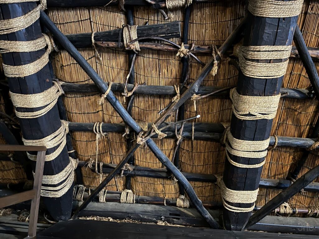 Und schon sind wir wieder in Tirol, oder? Nicht ganz, aber es ist dann doch interessant, dass Menschen in ähnlichen klimatischen Gegenden zu ähnlichen Konstruktionen gelangten. Wie hier mit Holzschindeln und darübergelegten, durch Steine beschwerten Stangen. Die Schindeln in dieser Region waren zumeist aus Kastanienholz oder aus japanischer Thuja (thuja standishii). Das Zentrum der Bauernhäuser auch hier ist das Herdfeuer. In Japan das versunkene Herdfeuer, also in der Erde. Der Rauch steigt auf und konserviert die Schindeln für eine Haltbarkeit von 20 Jahren und länger. Die Schindeln werden dann umgedreht und die Haltbarkeit nochmal um etwa 20 Jahre verlängert. Haus Tanaka