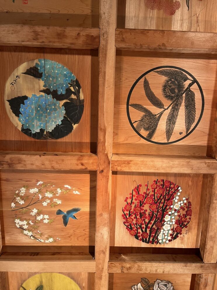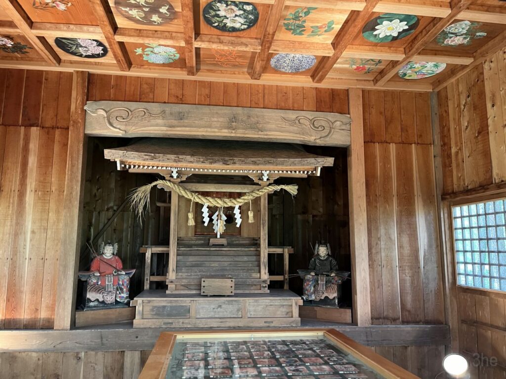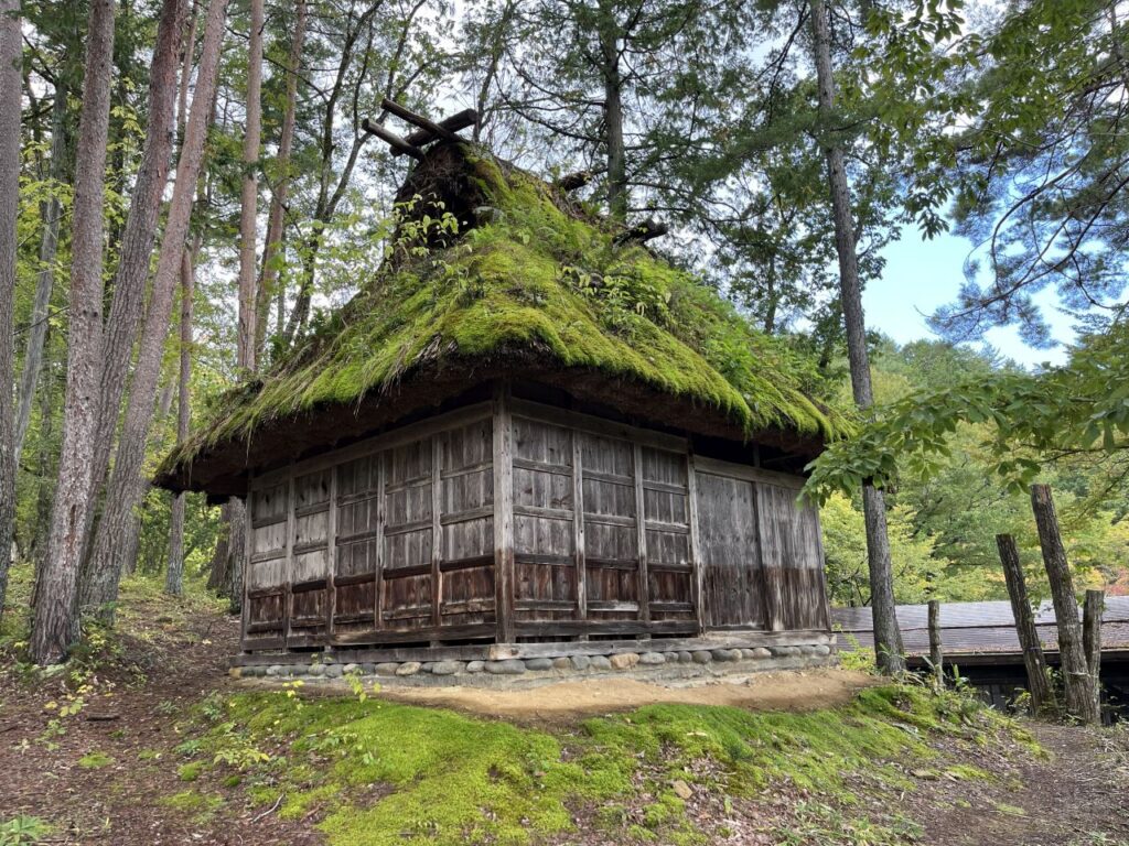 Dick ist die Strohschicht ja schon. Und wenn ich endlich wiedergefunden habe, welche Art Stroh verwendet wurde, wird das hier noch nachgereicht.Auch von innen ist die Dachkonstruktion interessant. Und alles mit Seilen gebunden.Diese Konstruktion mit den Dachgauben ist eher ungewöhnlich bis einzigartig und sollte mehr Licht und Luft bringen. Haus Hozumi, frühes 19. Jahrhundert.Haus Michikami, frühes 19. Jahrhundert. Dieses Bauernhaus stammt von der nördlichsten Ecke der Provinz Hida und ähnelt schon mehr den Bauernhäusern der angrenzenden Provinz. Im Gegensatz zu den meisten anderen Bauernhäusern im Museum hat dieses auch eine offene Veranda, stand also in einer nicht ganz so harschen Region. Ungewöhnlich auch, dass seitlich der untere Dachbereich abgeschnitten wurde, um mehr Licht und Luft für die Seidenraupenzucht zu haben. Am bemerkenswertesten finde ich ja die famose Bemoosung des Daches.Das Haus Michikami nochmal von der Seite, die abgeschnittene seitliche Dachkante gut sichtbar. Im Vordergrund links Haus Tomita.Ein Lagerhaus.Und dann gab es natürlich auch einen Schrein. Einen kleinen Schrein mit einer bemerkenswerten Decke.