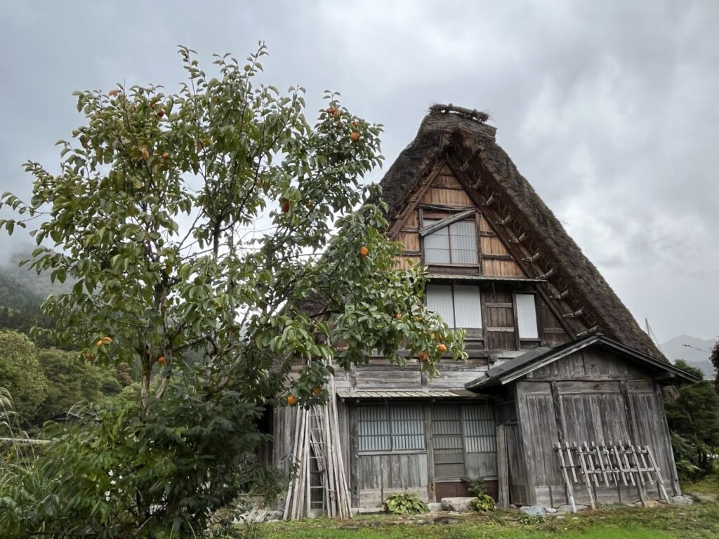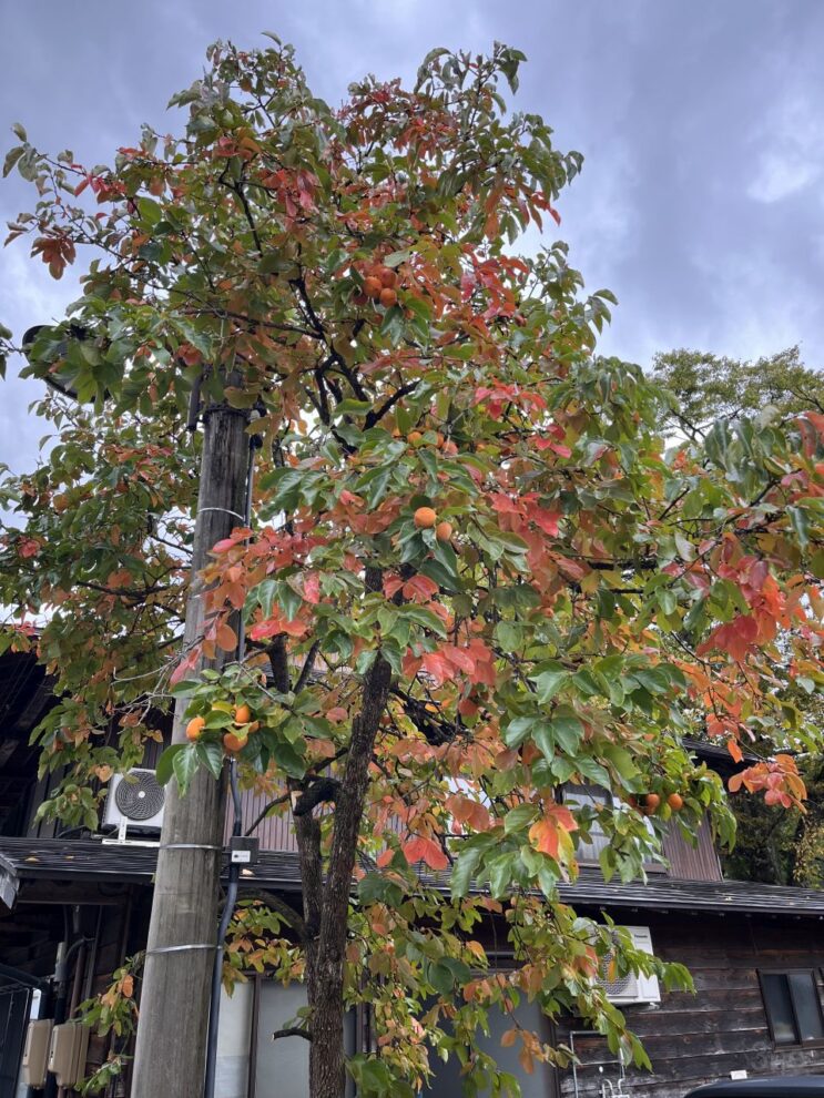 Im ganzen Dorf immer wieder aufgefallen sind uns diese Bäume mit den großen orangen Früchten mit glatter Schale. Kurze Recherche ergab, dass es sich um Kakibäume (Diospyros kaki) handelt. Die Kaki genannten Früchte haben unreif einen hohen Tanningehalt, der durch die späte Reifung oder Frost schwächer wird. Wirklich reif sind die Früchte dann im Spätherbst, wenn der Baum schon fast alle Blätter verloren hat. Auch solche Kakibäume haben wir vom Zug aus gesehen. Im Hotel in Kanazawa gab es am Frühstücksbüffet geschnittene Früchte, die mit Persimmon bezeichnet waren. Persimone ist eine Zuchtform der Kaki, hier wurde jedoch anscheinend die englische Bezeichnung für Kaki verwendet.