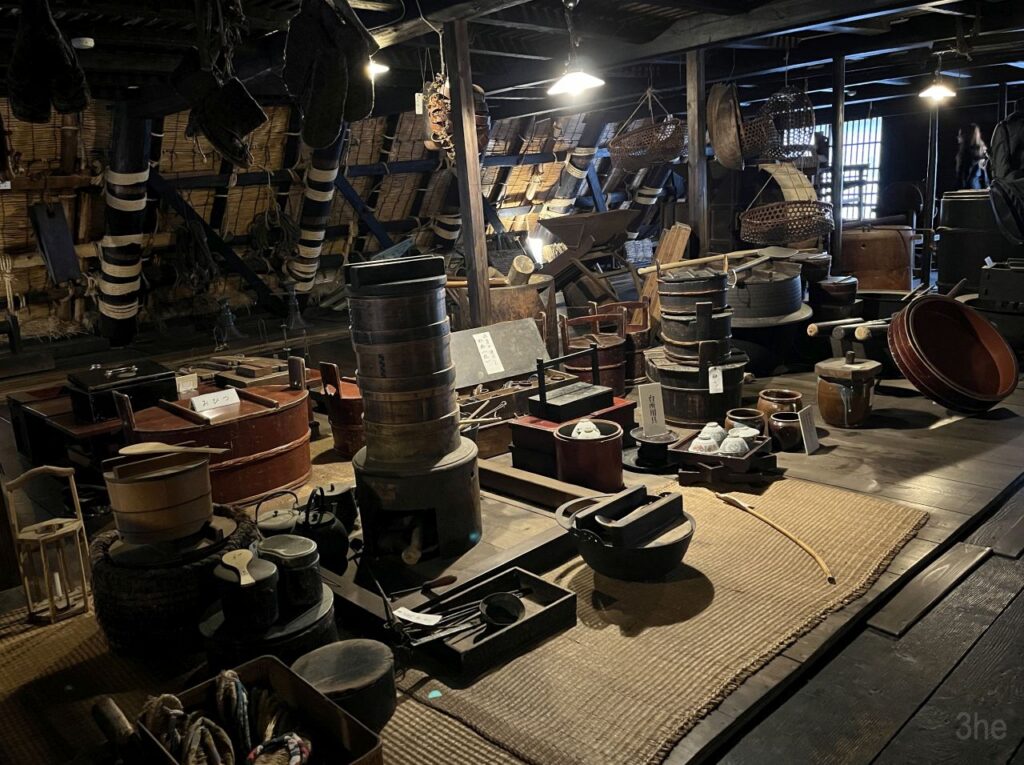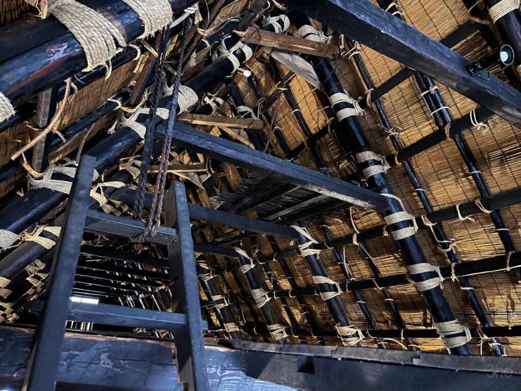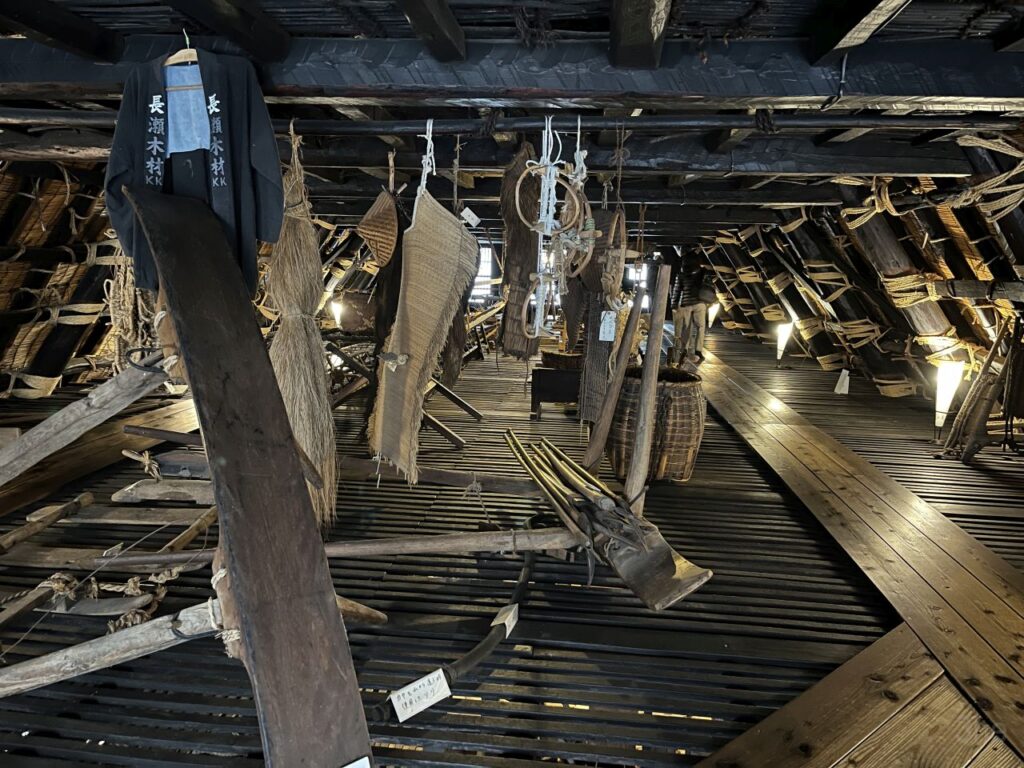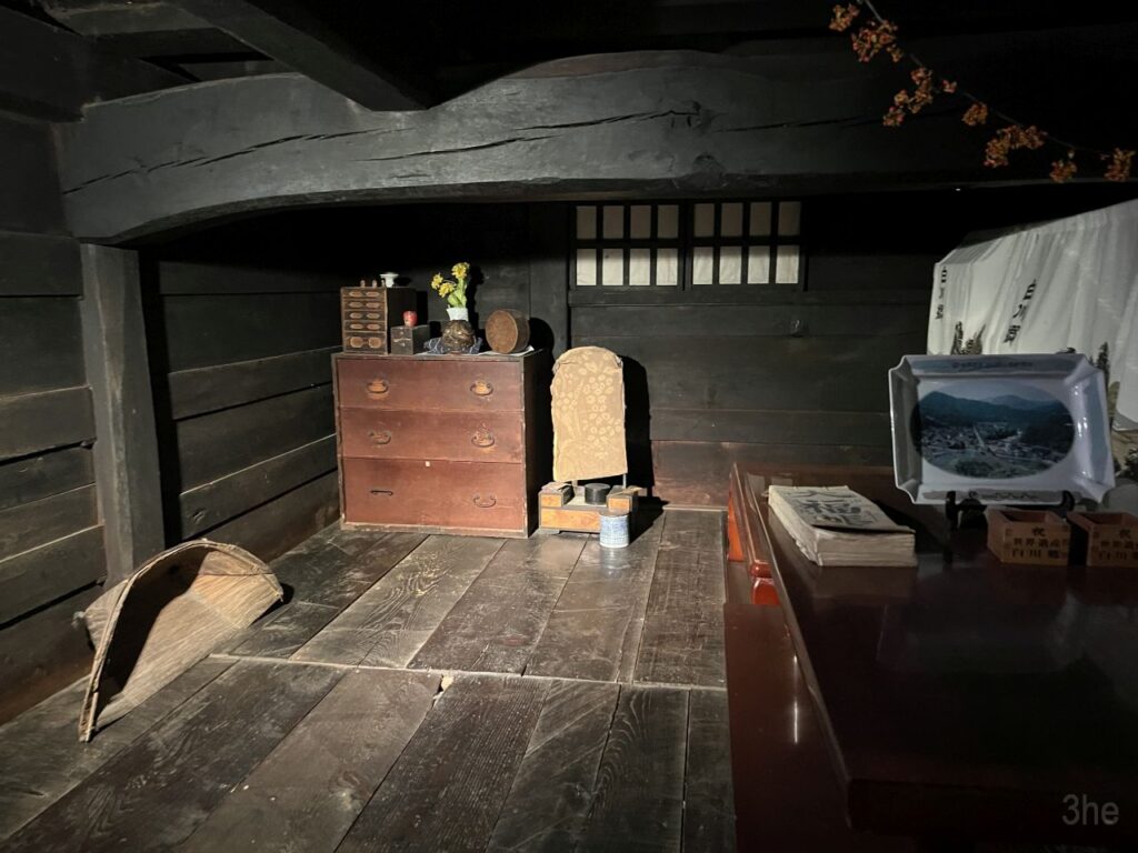 Eines der Häuser haben wir dann auch besichtigt. Das Erdgeschoss ist wie bei anderen japanischen Häusern auch. Schiebewände, Holzböden, Tatamimatten, Einbauschränke und ein Hausaltar, auch eine Feuerstelle. Spannend wird es dann oben. Das hier ist das fensterlose und sehr niedrige Zwischengeschoss, vor dem eigentlichen Dachgeschoss. Laut Beschreibung war dort das Gesinde untergebracht. Die Decken waren extrem niedrig, ich hätte nur gebückt stehen können.