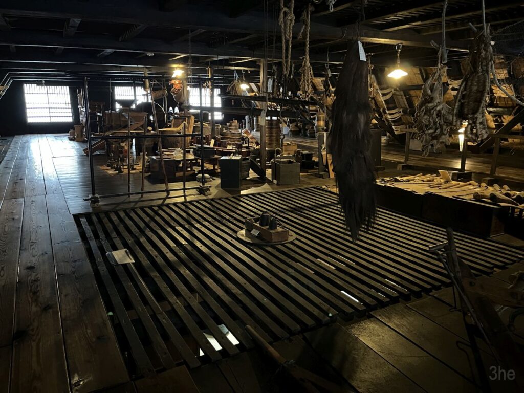 Ein Dachgeschoss höher bestand der Boden dann fast nur noch aus diesen Gittern. Und es waren hauptsächlich die Seidenraupenutensilien zu sehen. Außer im Fotovordergrund…