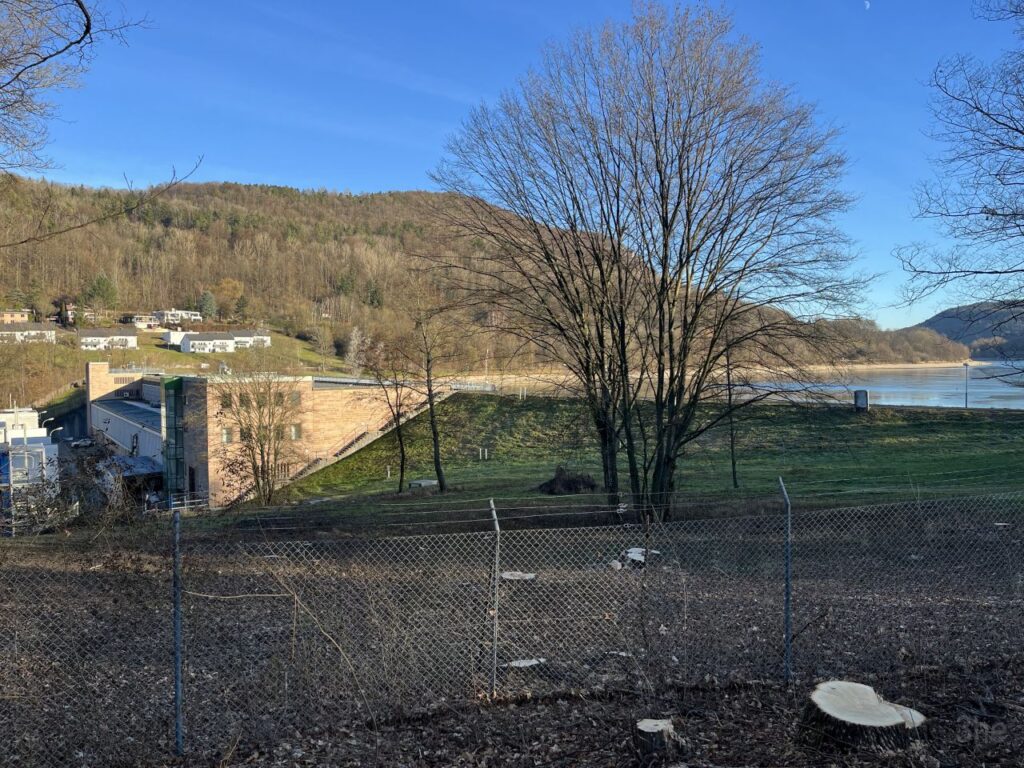 Der Happurger Stausee wurde ab 1955 als Unterbecken für das Pumpspeicherkraftwerk Happurg angelegt. Das Oberbecken entstand am benachbarten Deckersberg (586m). Das Pumpspeicherkraftwerk der Großkraftwerk Franken AG gehört heute zu Uniper und ging 1958 in Betrieb. Die Fallhöhe von Oberbecken zu Unterbecken beträgt 209m. Das Oberbecken hat ein Volumen von 1,8 Millionen Kubikmeter und konnte Wasser mit einer Lageenergie für 840 MWh Strom speichern. Es war damit das größte Pumpspeicherkraftwerk in Bayern (Quelle: Wikipedia). Bereits 1962 war das Oberbecken das erste Mal undicht und musste saniert werden. Das Wasser versickerte in den Rissen und Spalten der karstigen Hersbrucker Alb. Ein das Oberbecken unterquerendes Karst-Höhlensystem war dann auch die Ursache für weitere 2011 entdeckte Einbrüche und Wasserverlust. Das Oberbecken wurde vorsorglich geleert und das Kraftwerk außer Betrieb genommen. Seither wurden verschiedene Lösungsansätze verfolgt, die angekündigte Sanierung jedoch nie so recht angefangen und immer wieder verschoben. Seit Anfang 2025 wird nun allerdings wirklich gebaut am Gelände des Kraftwerks, laut Ankündigung von Uniper soll das Pumpspeicherkraftwerk bis 2028 wieder in Betrieb gehen.