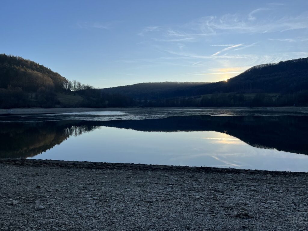 Der Bergrücken am gegenüberliegenden Seeufer ist die Houbirg. Auf 617m Höhe befindet sich dort im Wald ein abgegangenes keltisches Oppidum gleichen Namens. Im rechts aus dem Berg ragenden Felsstück befindet sich eine Hohler Fels genannte Höhle mit einem prähistorischen Fundplatz und einem tollen Ausblick über Gegend und nun auch See. Weiß ich sogar aus eigener Anschauung, war die Höhle doch immer mal wieder Ziel von Wanderungen mit Schule und Freunden. Auch die noch im Wald erkennbaren Reste der teilweise noch bis zu 10m hohen Wallanlagen des keltischen Oppidums machen die Wanderung zu einem Erlebnis. Eigentlich wäre es mal wieder Zeit für diese Wanderung…