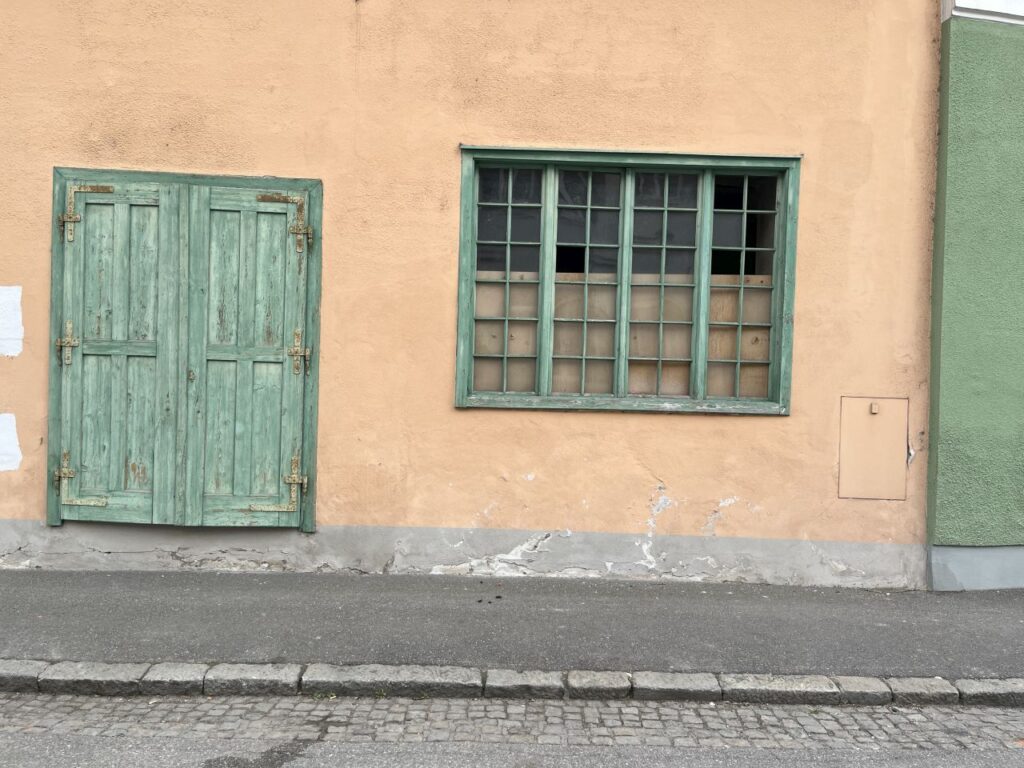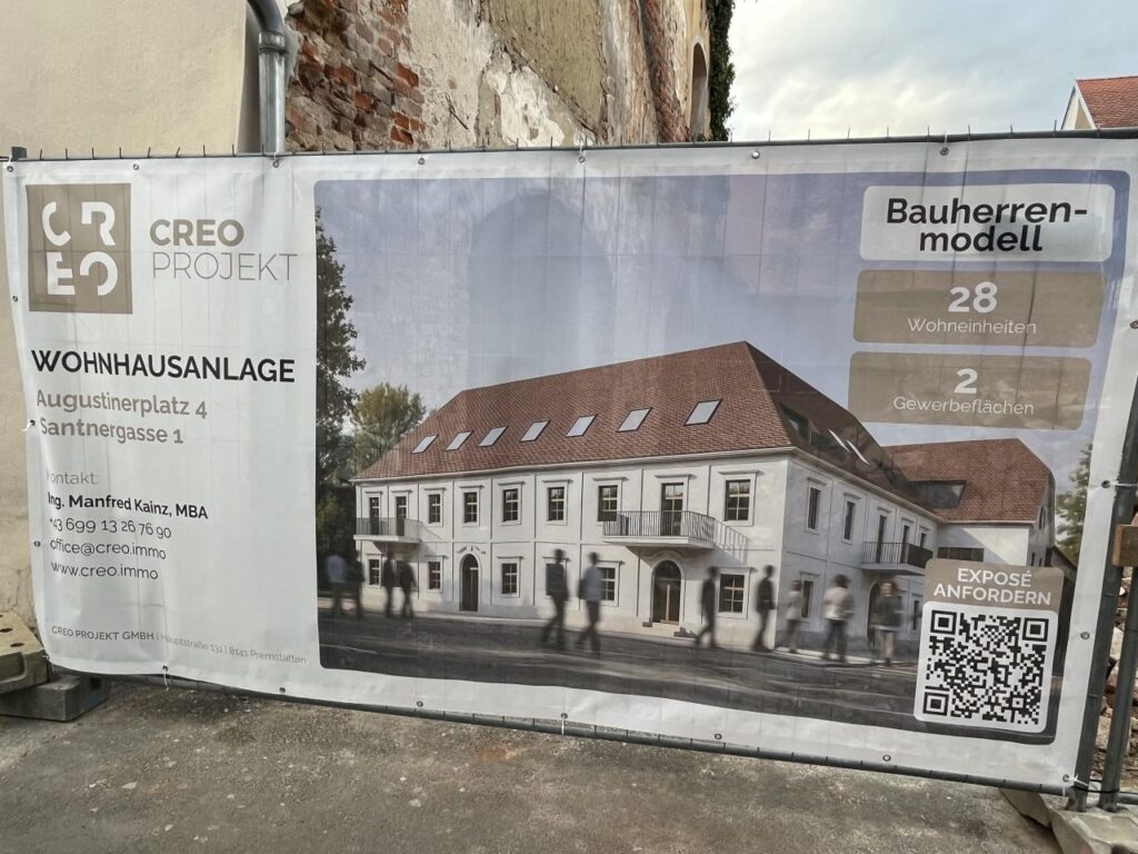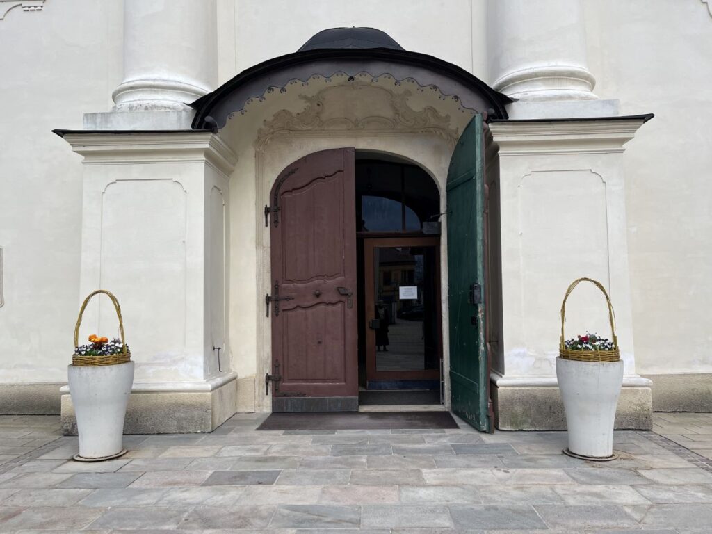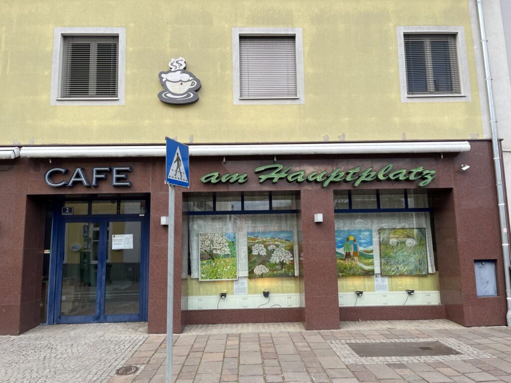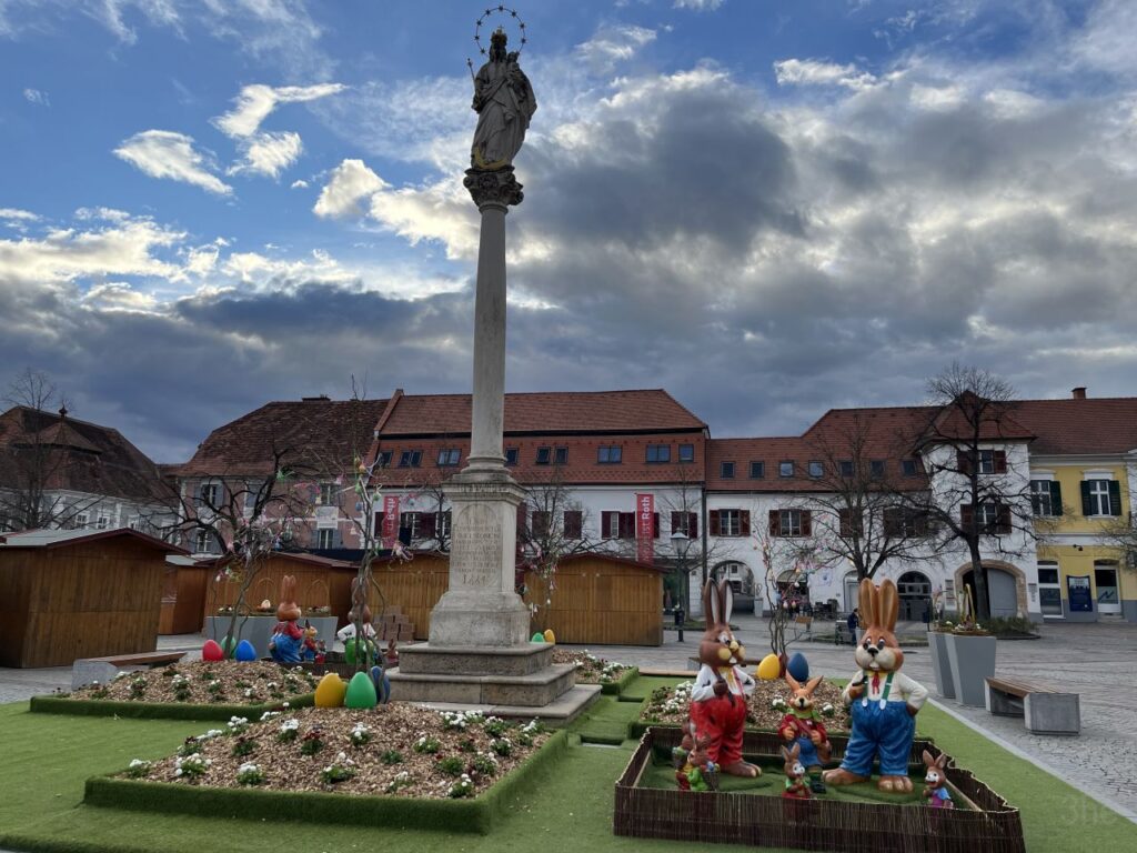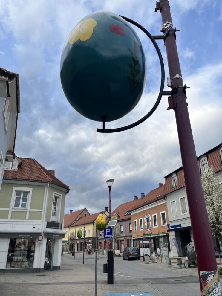 An der ehemaligen Tabakfabrik gehen wir diesmal nur vorbei.Die Kirchentür ist von der Fleischweihe am Nachmittag noch offen, also werfen wir einen kurzen Blick hinien.Die Stadtpfarre war lange in den Händen des Joanniterordens, an Gebäuden um die Stadtpfarrkirche findet man noch Hinweise darauf.Pfarrkindergarten in der Kommendegasse.Gegenüber des Joanniterareals wartet in der Kommendegasse ein Leerstand auf die Abbrucharbeiten durch den Investor.Am Hauptplatz wurde die Mariensäule mit österlicher Deko auf grünem Kunstrasen umgeben. Die Deko sorgt dann auch für ungläubige Blicke und amüsierte Grinser bei diversen Spaziergängern.Grüner Schriftzug und Schaufenstergalerie.