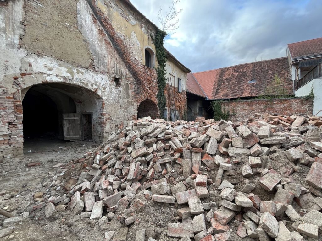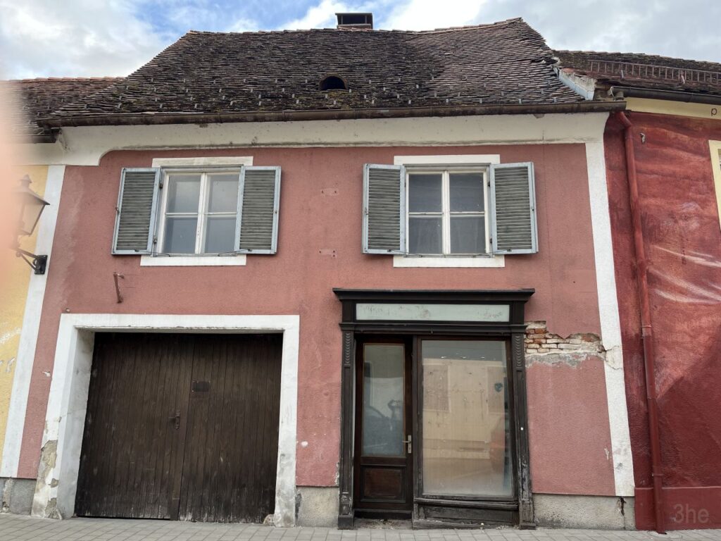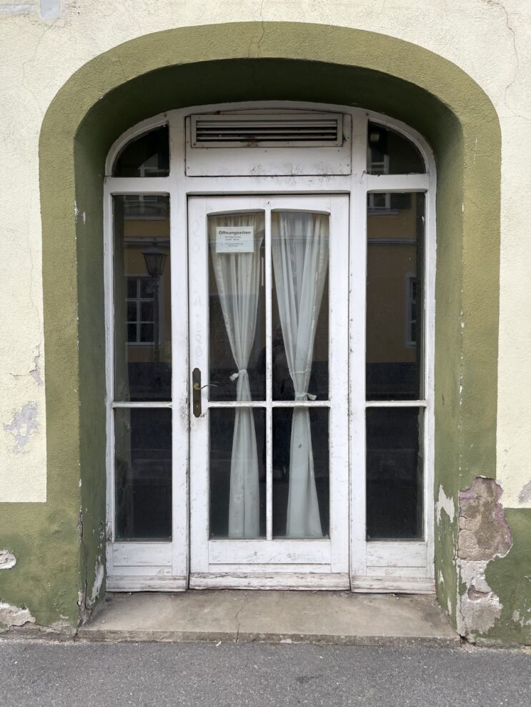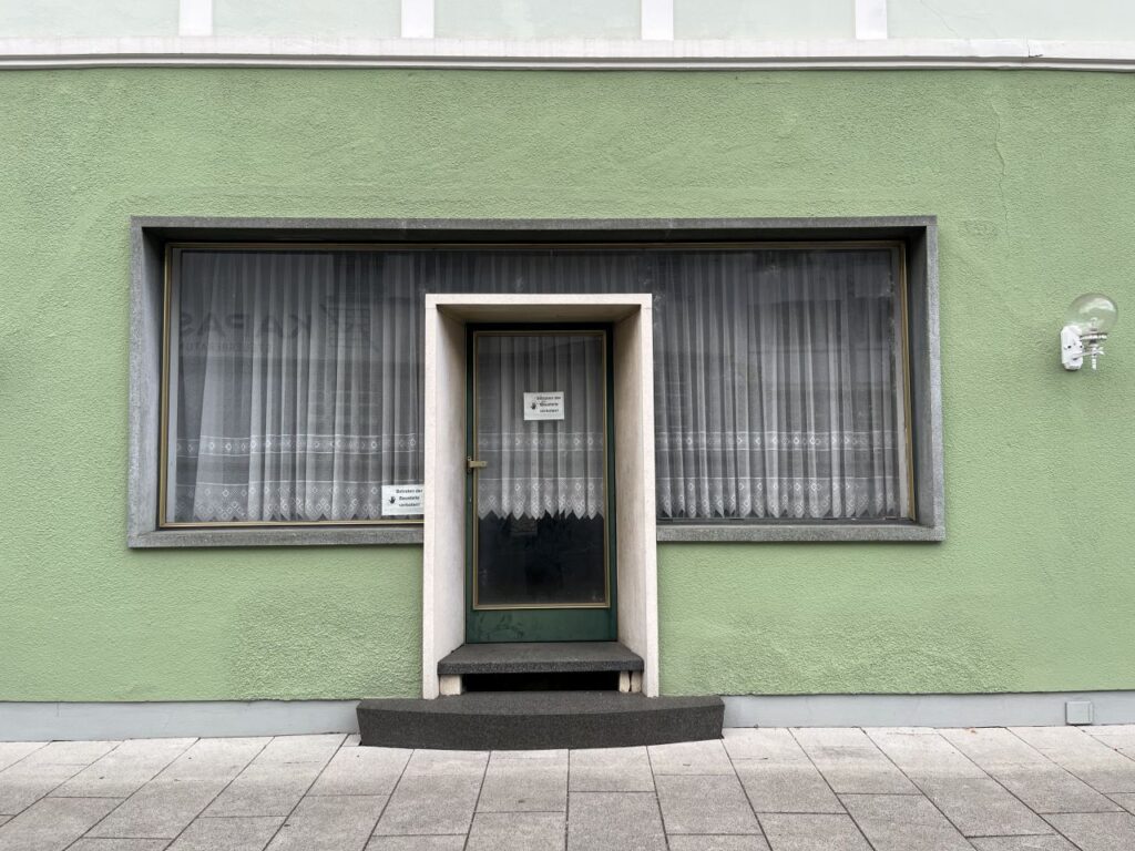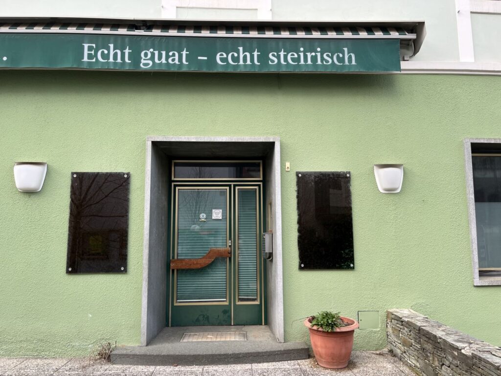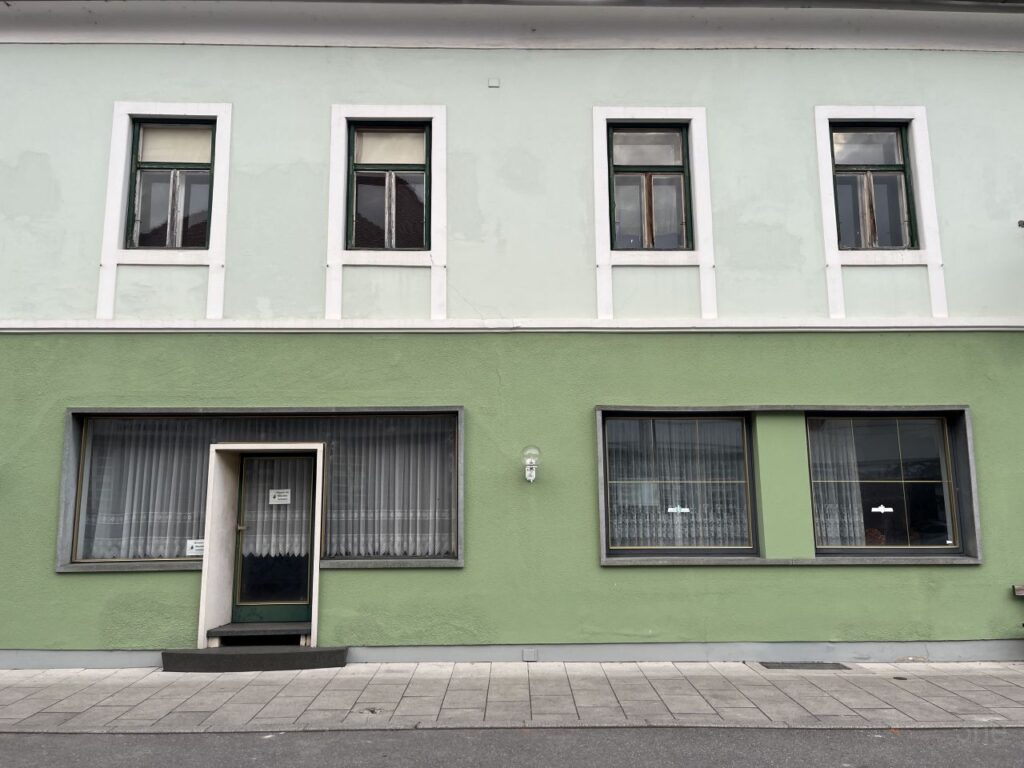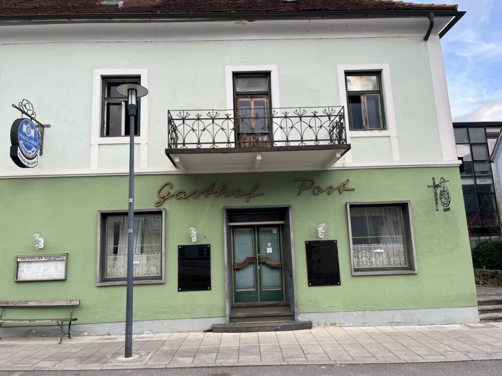 Da hat sich doch glatt ein nichtgrünes Tor dazwischengeschummelt. Es darf trotzdem bleiben.Nebeneingang des Gasthof Post.Bieht man um die Ecke, sieht das Erdgeschoss so aus. Während das Obergeschoss noch immer das 19. Jahrhundert erkennen lässt, wurde das Erdgeschoss vermutlich in den 1960er Jahren erneuert. Auch das Balkongeländer scheint noch original aus der Erbauungszeit vorhanden zu sein. Die leeren Tafeln deuten es an, der Gasthof ist geschlossen. Auch wenn die Gardinen etwas anderes suggerieren, der Gasthof ist bereits seit etlichen Jahren außer Betrieb.Echt guat, echt steirisch, echt grün. Und echt zua.Es hat den Anschein, als würde der Komplex des Gasthof Post bald aus dem Dornröschenschlaf erweckt werden.Einige Nebengebäude wurden bereits abgebrochen. Die beiden Hauptgebäude scheinen dem Rendering nach jedoch bestehen zu bleiben und saniert werden.